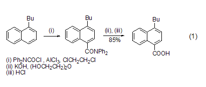 羧基的引入  在alcl3催化下,dpc-cl 可在芳環上引入一個羧基。烷基或烷氧基取代的芳環容易發生反應。產物二苯基酰胺用堿水解,再酸化可得到羧酸 (式1)[1]