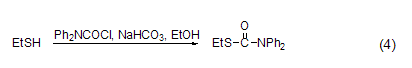 與巰基的反應  在堿性條件下 (如nahco3),在乙醇溶液中dpc-cl可與硫醇反應 (式4)[8]