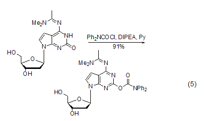 用作寡聚核苷酸合成時的保護基  在合成寡聚核苷酸時,鳥嘌呤核苷的堿基容易發生副反應,需要加以保護,dpc-cl可以將鳥嘌呤堿基的烯醇異構體酰基化而對其進行保護,這種方法在合成具有鳥嘌呤堿基和與鳥嘌呤堿基類似的核苷化合物時[9~12],發揮著重要作用 (式5)。